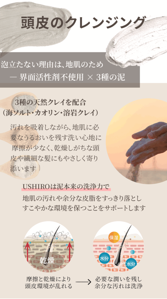 泥パックシャンプー USHIROは、3種の天然クレイで頭皮・毛髪を清浄にし、96%の美容成分で髪にうるおいを与えます。
