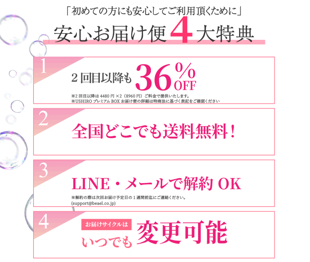 キャンペーン実施中の申し込みがおすすめです。USHIRO公式の特典について